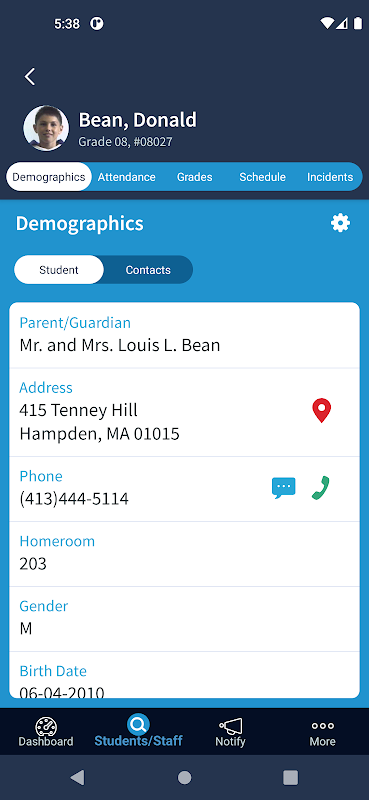 Dane demograficzne uczniów: Wybierz dowolne z pól bazy danych AdminPlus, które chcesz wyświetlić w aplikacji mobilnej AdminPlus, w tym pola bazy danych kontaktów i pola alertów. Filtruj i przewijaj wszystkich uczniów, pracowników i kontakty, aby szybko zadzwonić, wysłać e-mail lub wysłać SMS-a.
