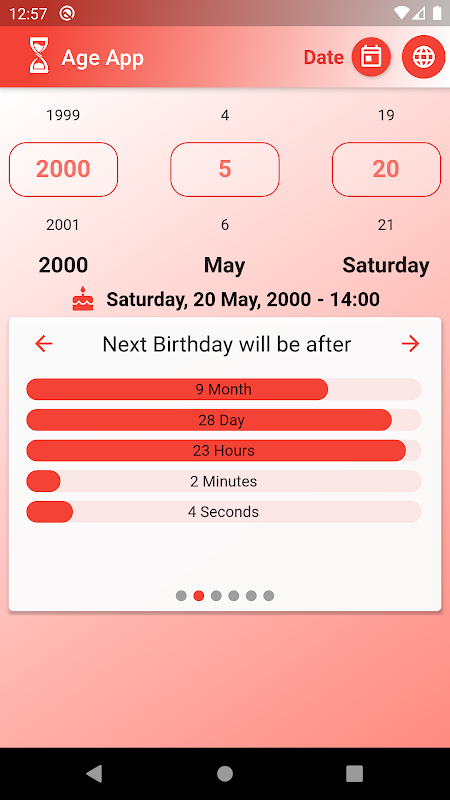 Ta aplikacja zapewnia prosty i piękny interfejs użytkownika, łatwy w użyciu. po prostu wybierz datę urodzin i / lub godzinę urodzin, a aplikacja Age obliczy bezpośrednio