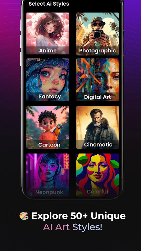 Możesz tworzyć wiele obrazów, eksplorując kreatywne odmiany swoich obrazów w różnych stylach. eksplorując te style, możesz stworzyć coś nowego w aplikacji generatora AI. Możesz usunąć wszystkie niechciane odmiany z Art AI -Picture Generator i możesz stworzyć nowe, z generatora AI Art. Jeśli masz pomysł w głowie, wpisz monit i natychmiast zobacz wygenerowaną rzeczywistość w ciągu kilku minut za pomocą generatora obrazów i obrazów AI.