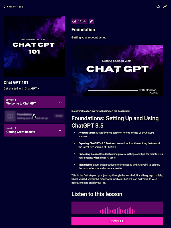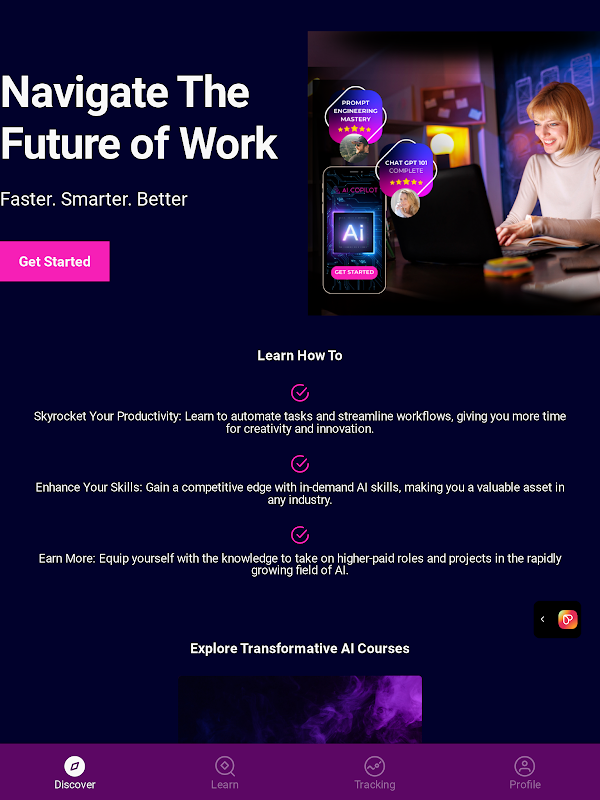 Dowiedz się, jak może pomóc Ci zaoszczędzić czas, zwiększyć produktywność i zwiększyć zyski. Wskocz od razu dzięki wciągającym lekcjom wideo i audio przygotowanym przez ekspertów AI. Nasze praktyczne eksperymenty i moduły progresywnego uczenia się przekształcają złożone koncepcje sztucznej inteligencji w zrozumiałe, praktyczne spostrzeżenia. Niezależnie od tego, czy jesteś firmą, która chce zwiększyć produktywność, czy osobą, która chce uzyskać przewagę nad konkurencją, mamy dla Ciebie wsparcie.