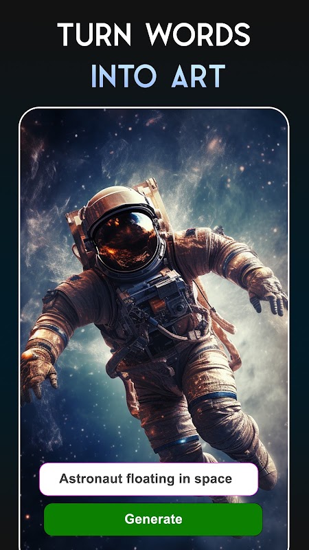 AI Art Generator and AI image creator is more than just an app; it's a gateway to a realm where imagination and technology intertwine to produce awe-inspiring visual masterpieces in AI Generated Art AI Photo. Utilizing advanced neural network algorithms, this AI art image generator app enables users, regardless of their artistic background, to delve into the world of creativity and produce artwork that resonates with their individuality. Want to see cat in a suit or any cool and wonderful art work? Enter "movie characters, song lyrics, poetry, astronauts, aliens, cityscapes, wonderland, Mars, forests" or whatever you have in mind. AI Art Generator and AI photo editor can create stunning paintings in thousands of possible styles, turning your dreams into visual Ai art in seconds, generating remarkable pictures that match your description.