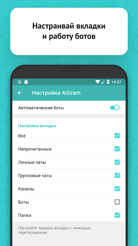 - Автоматическая сортировка групповых чатов, каналов, чат- ботов и т.д.;
