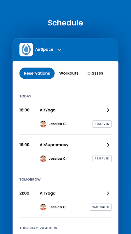 Dla członków AirSpace rezerwowanie miejsca na zajęciach, zapisywanie się na imprezy na siłowni i ogólne zarządzanie kontem, takie jak aktualizowanie zdjęć w głowę i zapisanych kart kredytowych.