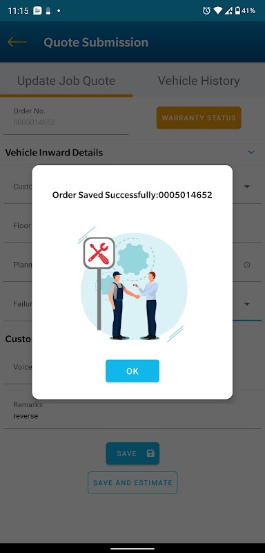 Aplikacja posiada funkcję przechwytywania głosu klienta i przeglądania historii pojazdu. Posiada również możliwość natychmiastowego wysłania wyceny/oszacowania naprawy przez e-mail lub SMS do klienta. Ta aplikacja jest przeznaczona głównie dla SA. Aplikacja będzie dostępna dla SA na podstawie aktywnego identyfikatora użytkownika DBM. Obowiązują OWH, prawa autorskie Ashok Leyland.