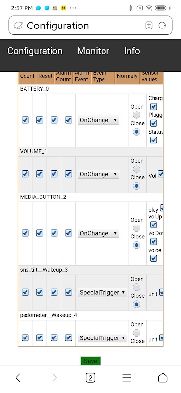To narzędzie może być przydatne do sprawdzenia, czy cały sprzęt czujnika telefonu działa poprawnie. Sensor może reagować inaczej niż inny producent Mobile. Więc zostawiam jeden parametr konfiguracyjny otwarty dla użytkownika tej aplikacji: Typ zdarzenia „OnChange” czasami nie jest tym, co naprawdę oznacza. W przypadku tych czujników można zmienić typ zdarzenia na „Ciągłe”. Aby wiedzieć, którego należy użyć, wystarczy obserwować czujnik na stronie „Monitor” i sprawdzić, czy ostatnie pole jest stale aktualizowane, czy nie.