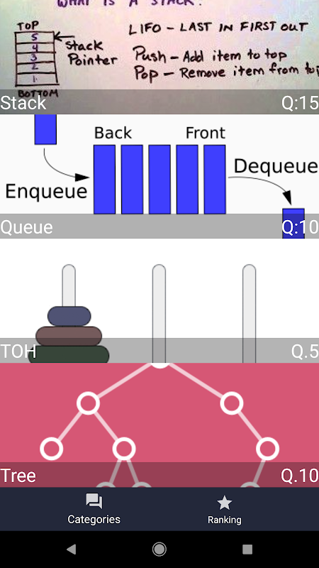 Aplikacja jest kompletnym bezpłatnym podręcznikiem dotyczącym struktur danych i algorytmów, który obejmuje ważne tematy, programy i niektóre pytania z wywiady, a także ma quiz internetowy, aby poprawić i przyspieszyć umiejętności.