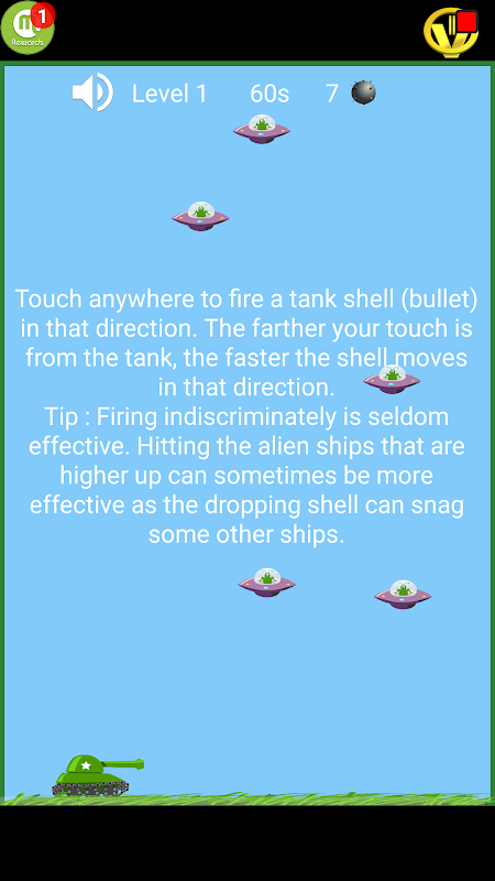 The skies of planet earth are dark with the alien spaceships hovering over and their intentions don't look benign. All of earth's defenses have been overrun. You are the ONLY hero left and the LAST defense. The good news is that all the other heroes did massive damage to the aliens and there are only a limited number of alien spaceships left. Your goal is to eliminate all the remaining spaceships and bring glorious victory to planet Earth !