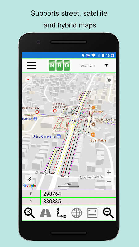 Idealny do umieszczenia na desce rozdzielczej pojazdu Tryb poziomy NRG Alignment Viewer zapewnia wyraźne aktualizacje pozycji urządzenia w czasie rzeczywistym pod względem współrzędnych WGS84, kartezjańskiego EN i geometrycznego wyrównania (łańcuch/stacja/metraż).