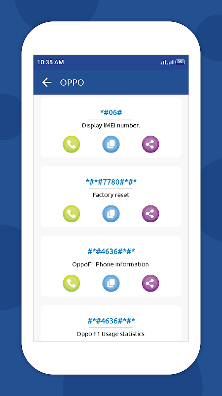 Uzyskaj ukryte informacje o swoim telefonie za pomocą tajnych kodów, takich jak *#06# dla numeru IMEI, poziomu promieniowania itp. i wielu innych. Kody sieciowe USSD obejmują urządzenia takie jak Samsung, Sony, Lenovo, LG, Ericsson, Motorola, BlackBerry, China Mobile, HTC, acer, Oppo, Xiaomi, generic, Nokia, Microsoft/Windows i Vivo Phone.