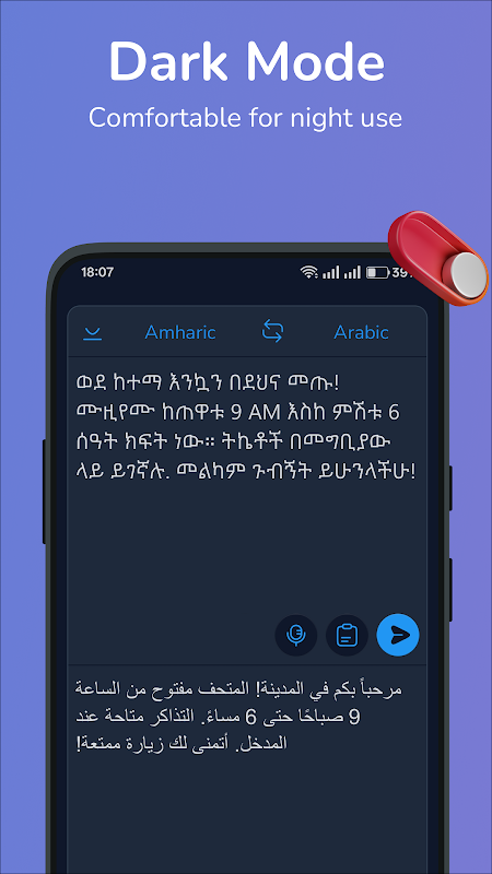 - Naturalne rozpoznawanie mowy: po prostu mów naturalnie i uzyskaj doskonałe tłumaczenia na język arabski lub amharski