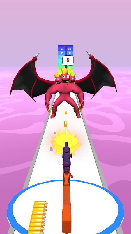 Start with a single bullet, collect and stack as many bullets as you can. Try to avoid traps and saws on road, you will lose stack if hit them. Load the bullets to guns to break down the walls stand on your way. Choose the magazine wisely to lose as least bullets as possible. Time to hold your bullets and take down everything block your way!