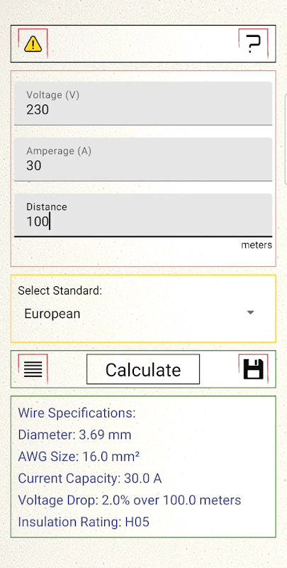 Z łatwością oblicz specyfikacje przewodów, w tym AWG, spadek napięcia i inne.