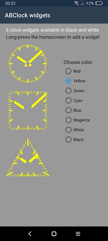 Trzy analogowe widżety zegara w dziewięciu kolorach, działające nawet po zamknięciu aplikacji.