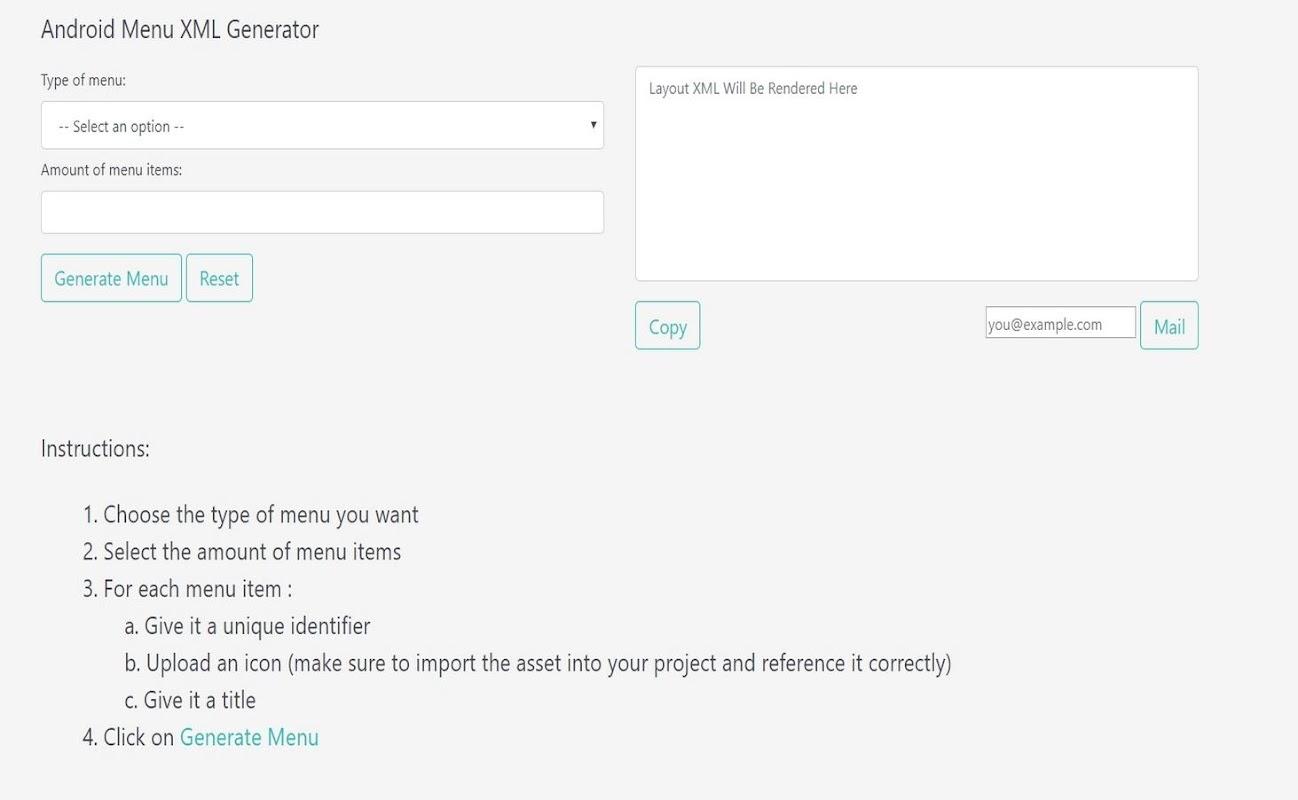 Generate any type of menu you need for your Android application. Choose from an Options, Context or Popup menu and select how many menu items you need. Define the title, icon and id for each menu item and by clicking the generate menu button, watch the code appear before your eyes.