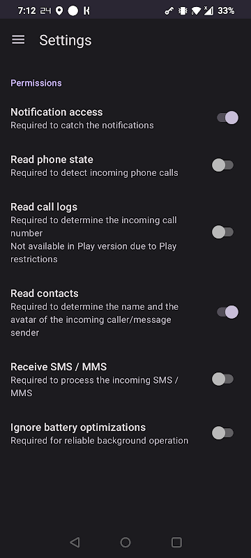 Wszystkie niezbędne uprawnienia są wymienione i wyjaśnione w menu Ustawienia / Uprawnienia