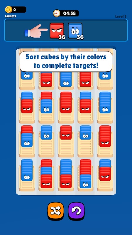 Użyj prostych elementów sterujących „dotknięciem” lub „przeciągnij i upuść”, aby sortować kostki według ich kolorów. Wszystko zależy od Twojego stylu gry!