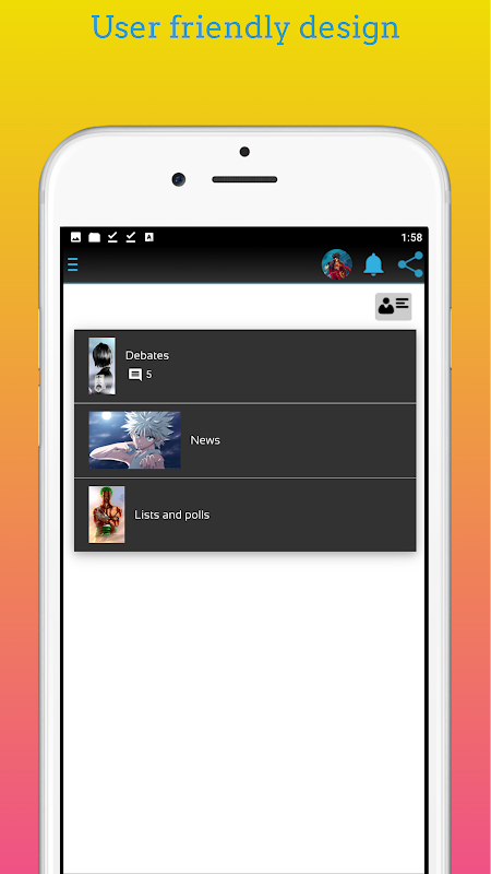 This app was created specifically for the fun and get together of all anime fans and lovers. It seeks to meet the socialisation, debate, quiz and vote needs of all anime fans.
