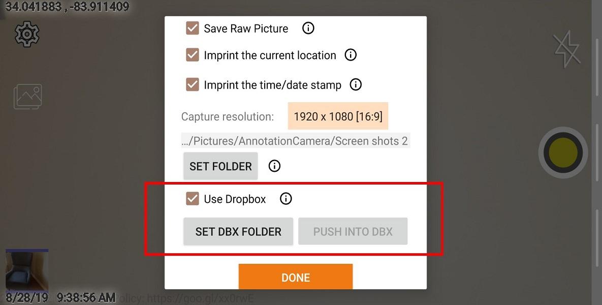 * Kamera adnotacyjna jest zintegrowana z Drop Box. Folder skrzynki rozwijanej można utworzyć lub wybrać za pomocą kamery adnotacyjnej jako domyślny folder kopii zdjęcia z adnotacją.