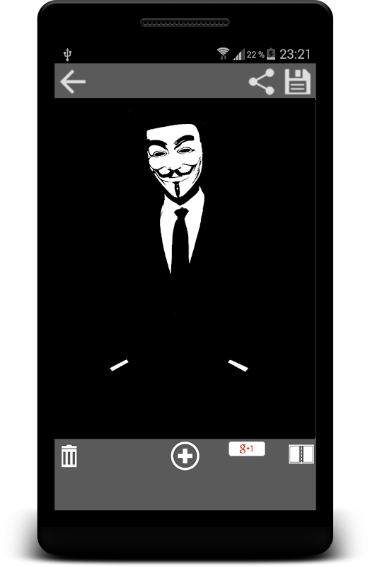 Easy choose a picture from gallery or take one by your self. Select your favourit Anonymous Vendetta Mask with the Plus Button in center. Easy touch on the mask to add it to your picture.