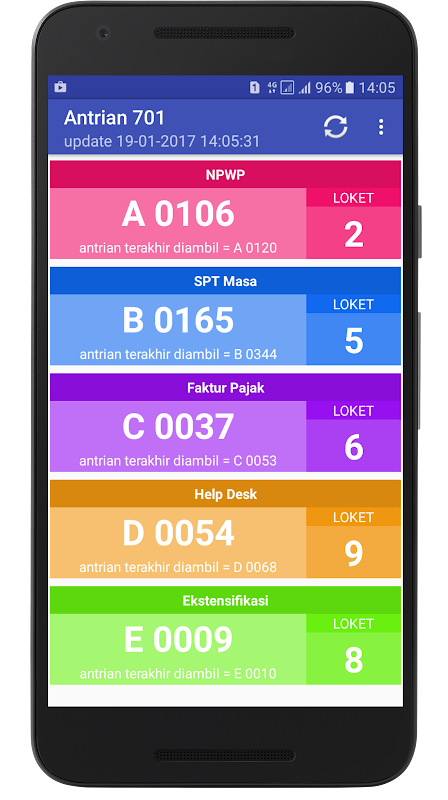 Pantau Nomor Antrian KPP Pratama Pontianak Barat via Android. Pelaporan kewajiban perpajakan secara manual sekaligus pemberian layanan (misal NPWP, SKB dll) dipusatkan pada Tempat Layanan Terpadu (TPT) melalui sistem antrian di KPP Pratama Pontianak Barat bisa dipantau secara online realtime.