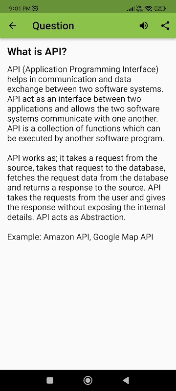 Pytania do wywiadu dotyczące testowania API: Dla osób szczególnie zainteresowanych testowaniem API nasza aplikacja zawiera specjalną sekcję z ponad 100 pytaniami dotyczącymi koncepcji testowania API. Pogłęb swoją wiedzę i zwiększ pewność siebie w scenariuszach wywiadów API Testing.