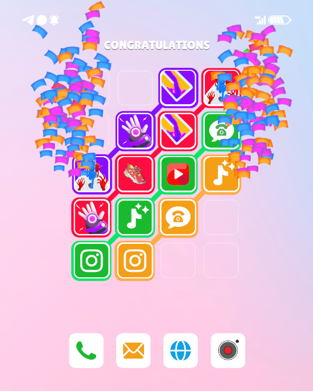 In this game you'll switch position of the apps as you normally do on your phone to set them in the right zones. The thing is in the colour of the zone and background of the icons. Make them match and clear the levels.