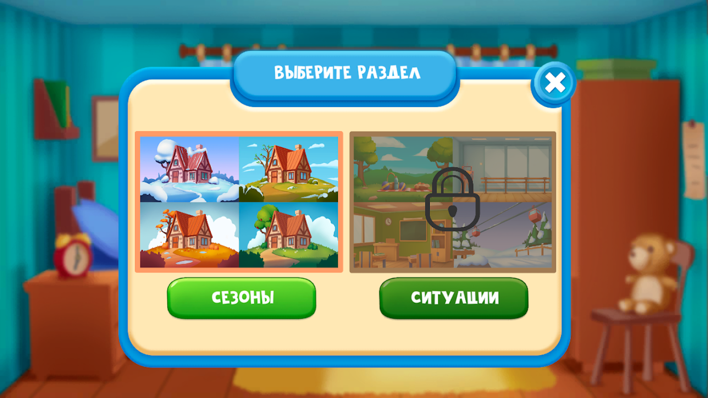 ○ Testowanie. Sezon lub sytuacja jest ustalana i wyświetlana jest seria zdjęć, dziecko musi wybrać te, które odpowiadają sezonowi lub sytuacji.
