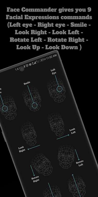 Face Commander Arduino i kontroler Bluetooth ESP32 zapewniają 9 poleceń dotyczących mimiki twarzy (lewe oko - prawe oko - uśmiech - spójrz w prawo - spójrz w lewo - obróć w lewo - obróć w prawo - spójrz w górę - spójrz w dół) Każda twarz