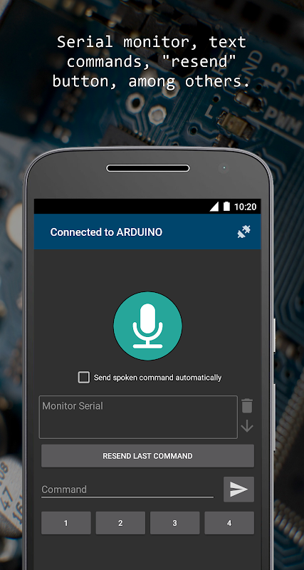 Through the +Arduino Control you can send voice and text commands to your Arduino via Bluetooth and still simplify your program. Thanks to the command map you will be able to make a simple logic in your Arduino, it works like this: you give a command to the app and it sends a code that you configure to your Arduino (e.g., when you say "on" the app will send "1" to the Arduino)!