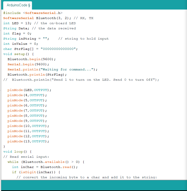 - Bluetooth HC-06 connect to arduino: SoftwareSerial Bluetooth(3, 2); // RX, TX
