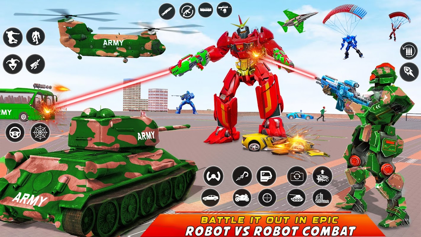 Get into the city battle of new robot games and army bus games. You will be surprised to play the exclusive variation of transformations with realistic feels. There are multiple modes of this robot game with various options of battle machines to choose from. Get trained to fight the future robot battle on ground and air battle with jet fighters. Don’t miss to avail the real opportunity of playing army bus games and flying car games in single small package.