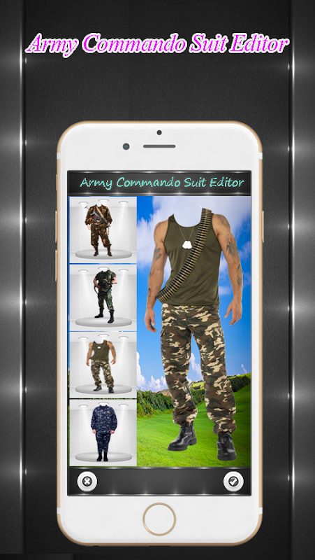 Kombinezon wojskowy ze zdjęciem komandosów zapewnia oficjalny i sprawczy strój w Twojej szafie. Podczas tej aplikacji istnieją ramki do zdjęć. Określany jako miłośnik armii, który uczestniczy w obronie przed wojną i atakiem.