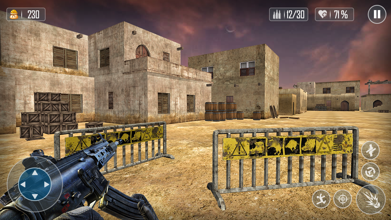 Army Commando Shooter ma 5 różnych poziomów, które musisz ukończyć, aby wygrać grę. Misje te obejmują: Arena23, Aftermath, The Hunt, Karcho i Destroy City. Wszystkie misje mają różną liczbę wrogów, a ci terroryści są dobrze wyszkoleni i dobrze wyposażeni. Army Commando to pierwszoosobowa strzelanka z grafiką wysokiej jakości.