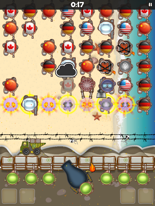 Enemy soldiers will swarm down from the top. Your soldiers are tough but can be overwhelmed if out numbered. Your goal is to prevent as many enemies from reaching your defense as you can. Match enemies of the same country together to create awesome combo effects.