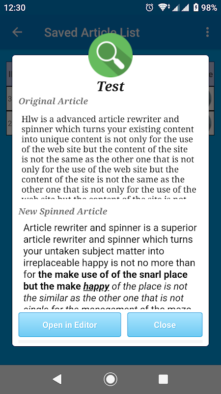 Jest to zaawansowany program do ponownego pisania artykułów i spinner, który zamienia twoją istniejącą treść w unikalną treść. Najlepsze narzędzie do spinania i przepisywania artykułów oraz po raz pierwszy w sklepie Google Play, nie znajdziesz tego rodzaju płynnego i szybszego narzędzia, które może przepisać artykuł bez zmiany jego znaczenia