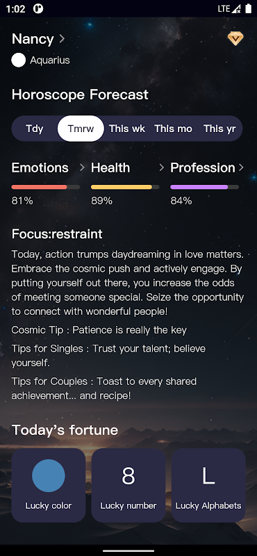 Wszystko, czego chcesz dowiedzieć się o sobie, swoich mocnych i słabych stronach, a nawet przebłyski przyszłości są skonsolidowane w tej jednej aplikacji! Skonsultuj się z naszymi doświadczonymi astrologami i uzyskaj wszystkie odpowiedzi, których szukasz! I pamiętaj, szczęście się do Ciebie uśmiecha!