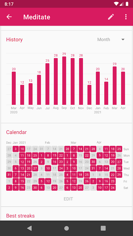 Kompleksowe statystyki: zyskaj cenne informacje na temat swoich postępów dzięki szczegółowym wykresom i statystykom. Przewiń całą historię swoich nawyków, aby z czasem zobaczyć poprawę.