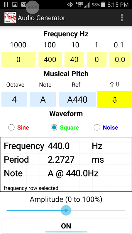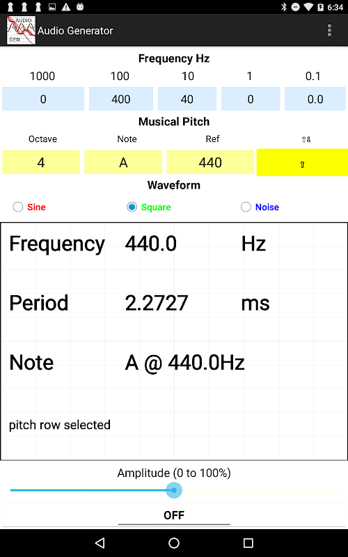 AudioGenerator streams data to the audio output (music stream) of an Android device using the user selected function, frequency, and amplitude. Waveforms available are sine, square, and noise. Frequency is selected by buttons arranged in two rows. The top row permits digital entry of the frequency. The bottom row permits entry by musical note names and octaves. Audio output amplitude can be adjusted from 0-100% with the amplitude slider. A numeric readout shows frequency, period, and nearest musical note (based on A=440Hz) for sine and square signals (noise contains an assortment of frequencies).