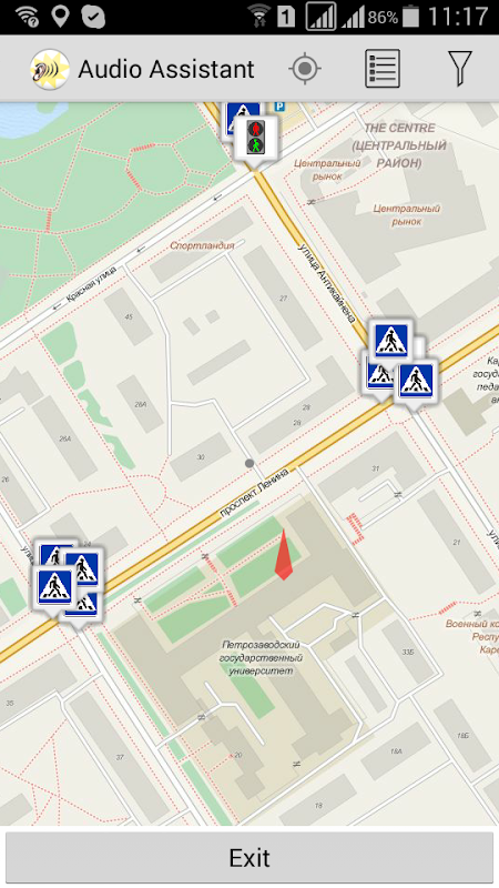Application detects person location and informs him about nearby obstacles and social facilities.