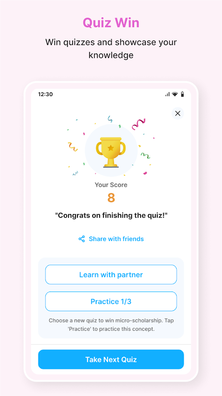 Quizy stypendialne: Gdy uczniowie zaakceptują zaproszenie i zarejestrują się w aplikacji, przystępują do 10-minutowych bezpłatnych quizów stypendialnych zgodnych z programem nauczania. Każdy quiz składa się z 10 pytań wielokrotnego wyboru, a uczniowie mogą wziąć maksymalnie 4 quizy miesięcznie dla każdego z 5 przedmiotów (angielski, matematyka, nauki ścisłe, nauki społeczne, język ojczysty).