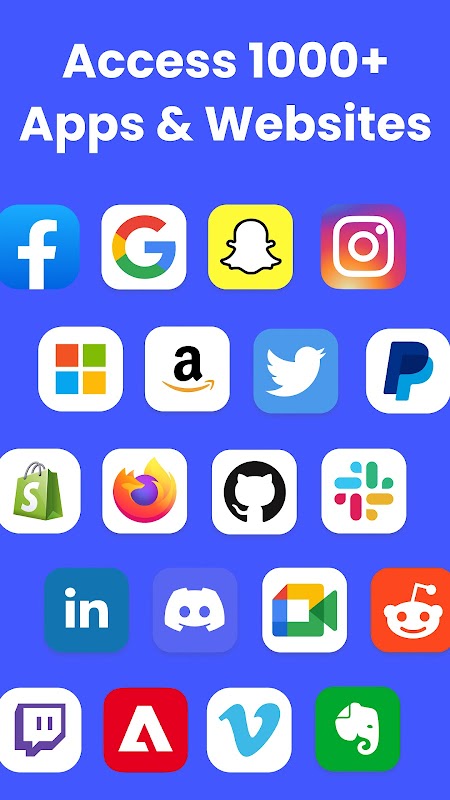 Kompatybilny z popularnymi usługami, takimi jak Google, Facebook, Amazon, Microsoft, Instagram, Roblox, X i tysiącami innych.
