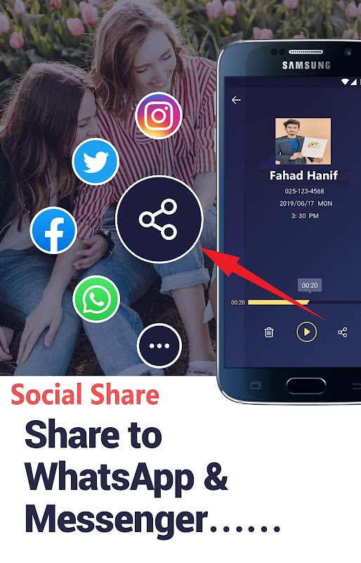 2. You can play back, or save your call to mp3 files on your SD card and share to WhatsApp and Messenger with one click.