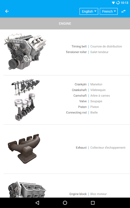 Użytkownicy mogą wyszukiwać i tłumaczyć terminów technicznych w języku francuskim, angielskim, niemieckim, hiszpańskim i włoskim i dostępowych powiązanych obrazów i plików dźwiękowych.