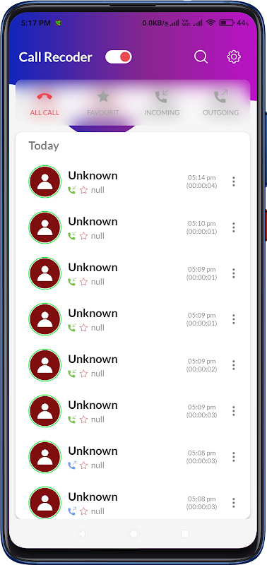 Search for recordings by contact or phone number. There is no limit in to call recording time it can save upto hours.