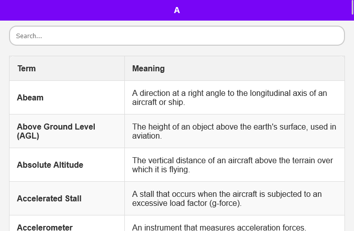 Zaawansowana funkcja wyszukiwania: szybko znajduj definicje określonych terminów lotniczych, korzystając z naszej zaawansowanej funkcji wyszukiwania. Niezależnie od tego, czy szukasz wysokości, czy odchylenia, będziesz mieć natychmiastowy dostęp do szczegółowych wyjaśnień.