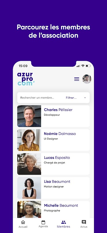 Aplikacja mobilna AzurProCom jest teraz dostępna bezpłatnie dla wszystkich członków stowarzyszenia. Użyj go, aby uzyskać dostęp do plików kontaktowych członków stowarzyszenia. Znajdź również wszystkie wiadomości o stowarzyszeniu, zapisz wydarzenia w swoim kalendarzu i zarejestruj się bezpośrednio z aplikacji na HelloAsso.