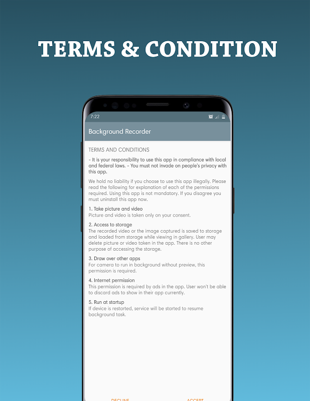 Background Recorder is app designed to capture image | record video | record audio without preview or without user interface, with no bother to open native camera or voice recorder when needed immediately.