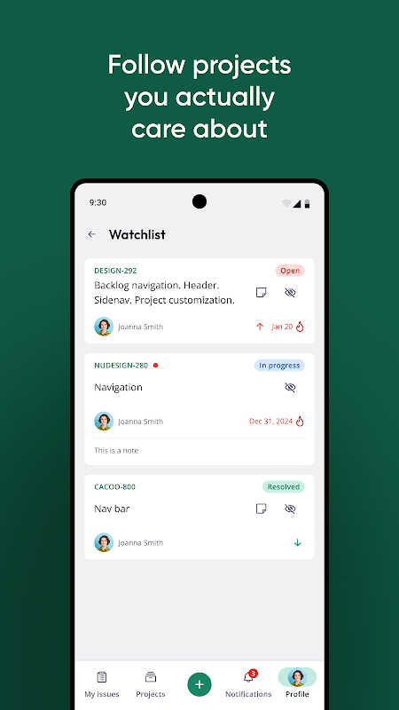 Z zaległości Android App, można uaktualnić swoje projekty on-the-go. Zostaw komentarz natychmiastową opinię na temat wątków i dodawać lub edytować problemów bezpośrednio z urządzenia.