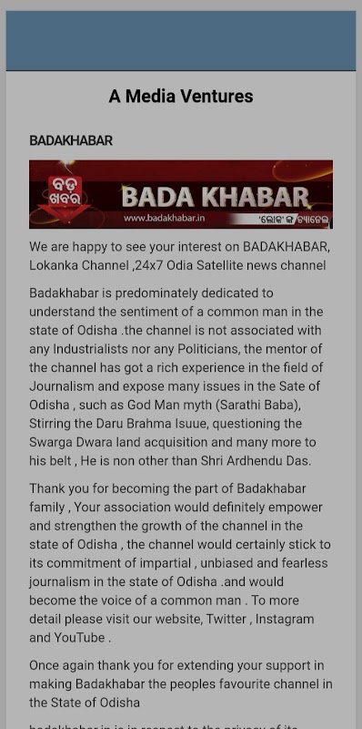 >Thank you for becoming the part of Badakhabar family , Your association would definitely empower and strengthen the growth of the channel in the state of Odisha , the channel would certainly stick to its commitment of impartial , unbiased and fearless journalism in the state of Odisha .and would become the voice of a common man . To more detail please visit our website, Twitter , Instagram and YouTube .