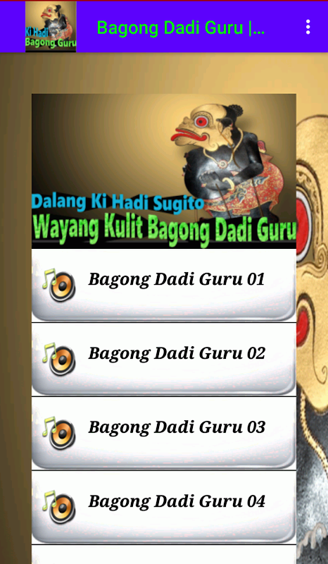 Ciesz się najlepszą kolekcją lalek ze skóry jawajskiej w sztuce Bagong Dadi Guru w wykonaniu Ki Dalang Hadi Sugito. Sztuka Bagong Dadi Guru obraca się wokół jednego z najmłodszych (ale nie mniej popularnych) Punakawan - najmłodszego z Ki Semar. Czy to prawda, że Bagong jest nauczycielem? Jak i dlaczego Bagong został nauczycielem? Zainstaluj i znajdź odpowiedź.